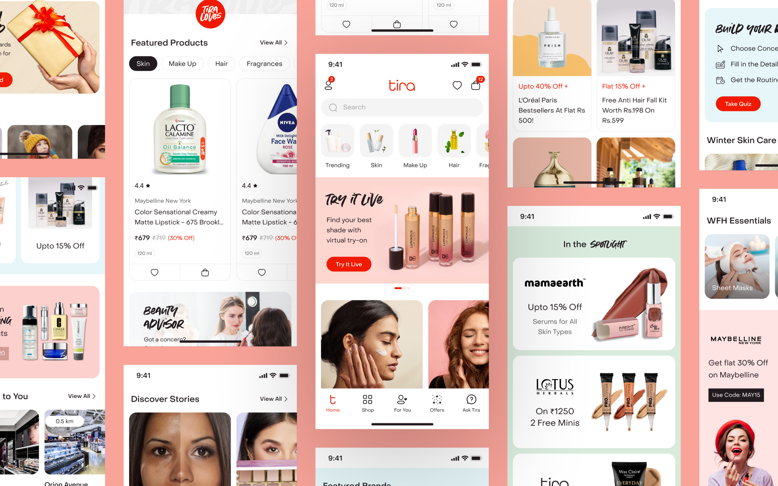 The design execution for Tira centered around crafting a clean, intuitive & personalized shopping experience that blended beauty discovery with trust. The redesigned interface prioritized personalization, offering curated recommendations, tailored content & relevant offers to boost engagement. By introducing less clutter & organizing navigation with precision, users could browse effortlessly & find what they needed without friction. Each touchpoint, from home screens to product detail pages – was optimized for clarity, emotional warmth & conversion. Beyond aesthetics, the experience was built to foster trust, connecting users with expert advisors & content that addressed real beauty & wellness needs, turning casual shoppers into confident loyalists.