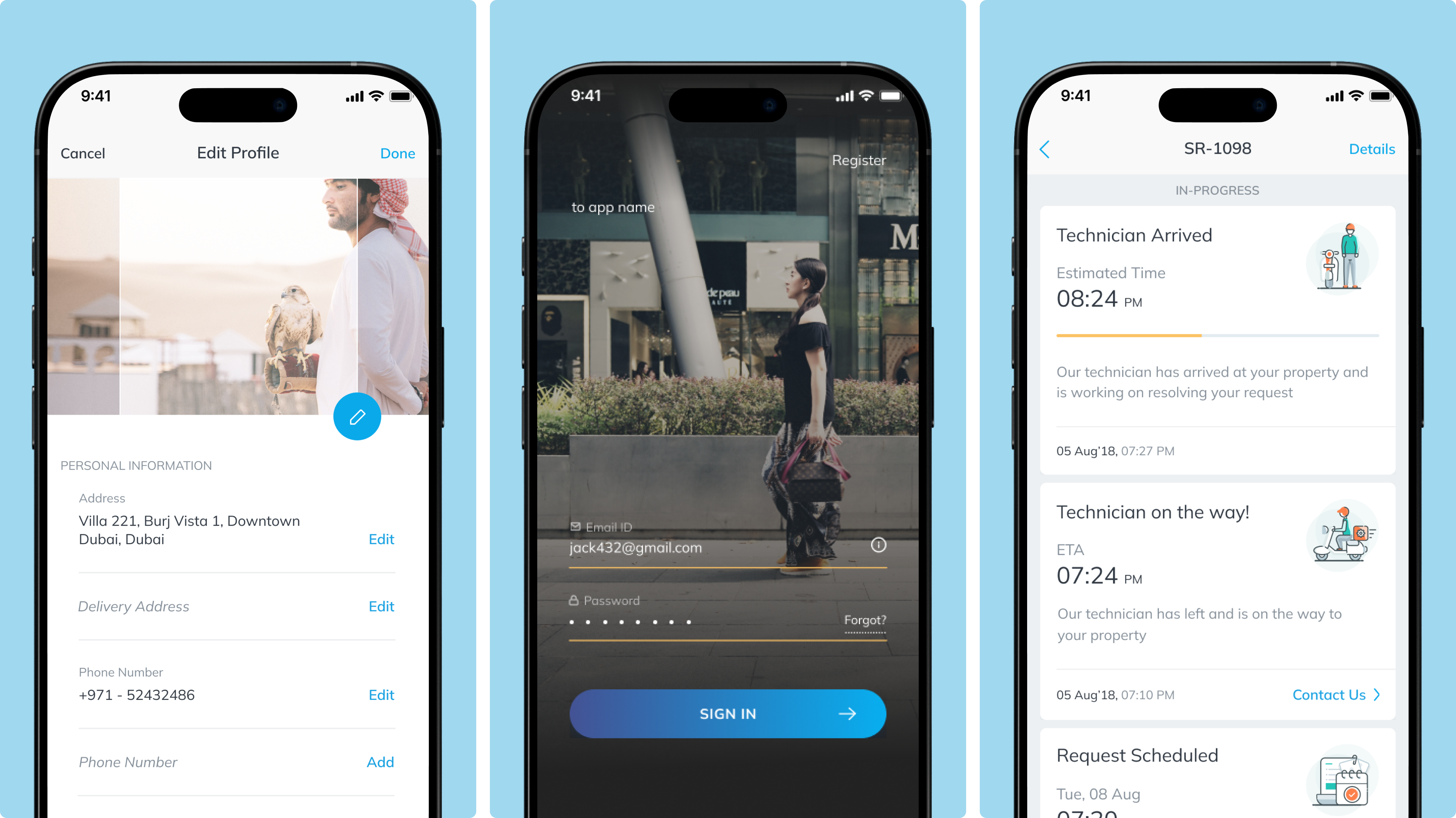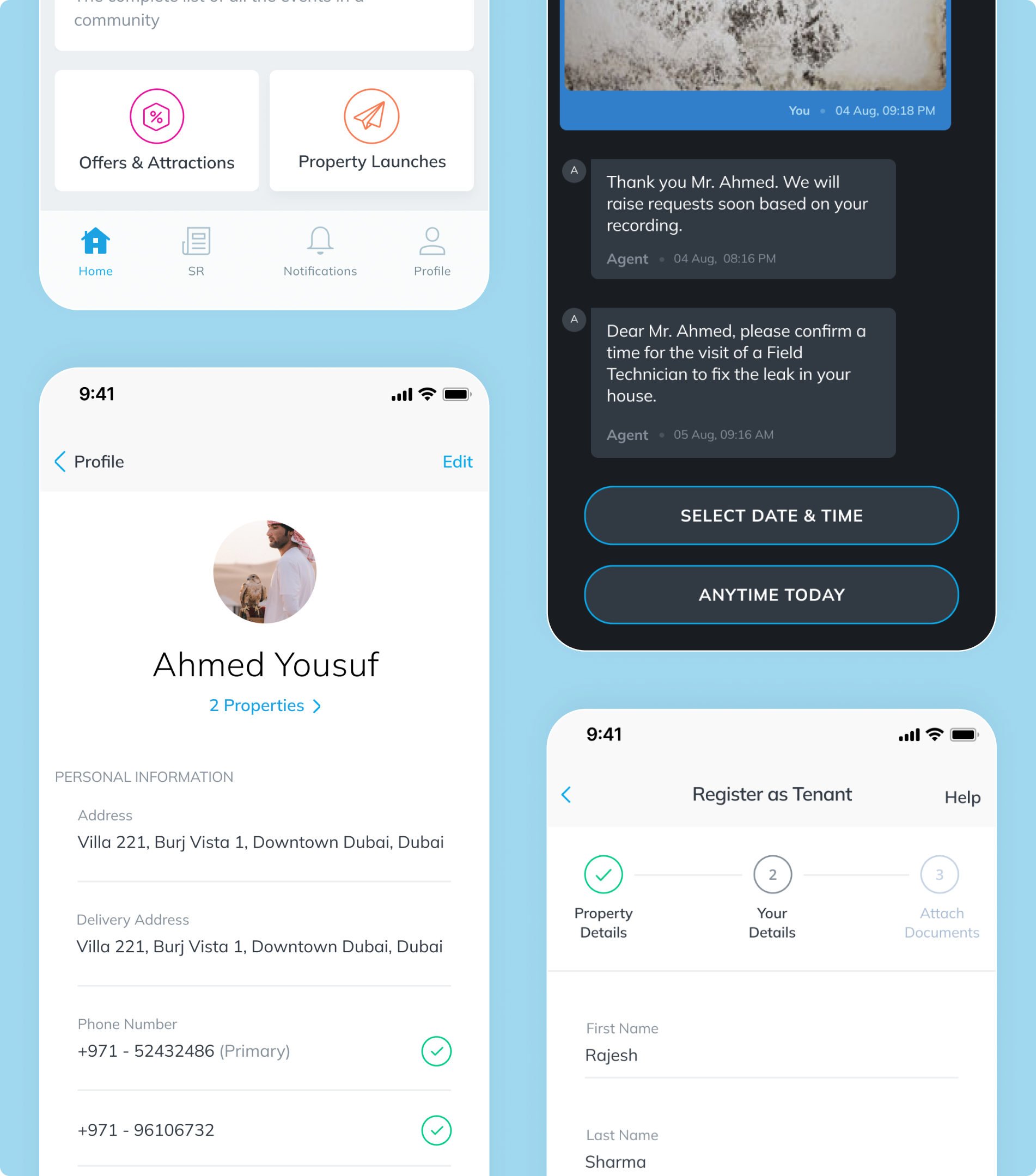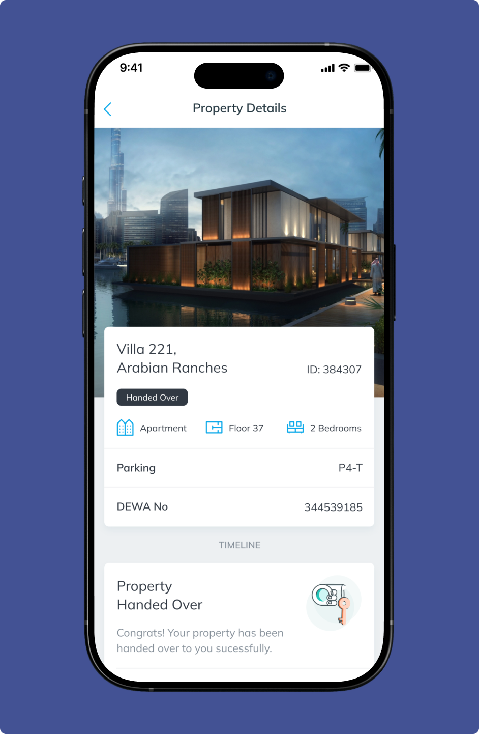 The mobile app enables customers to manage payments, handovers, service requests, construction tracking, and document access within one seamless experience.