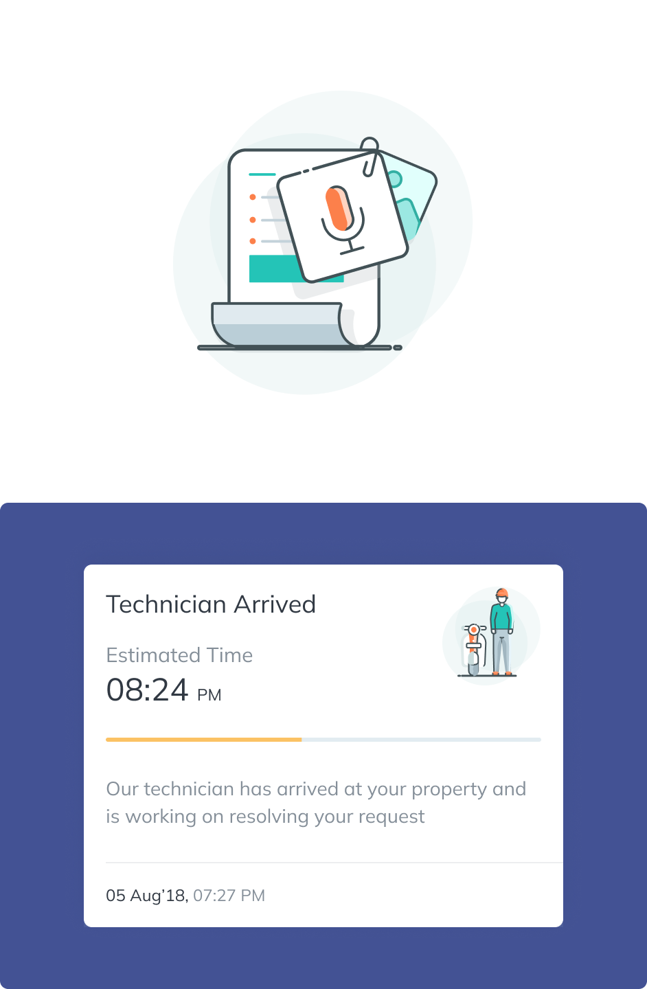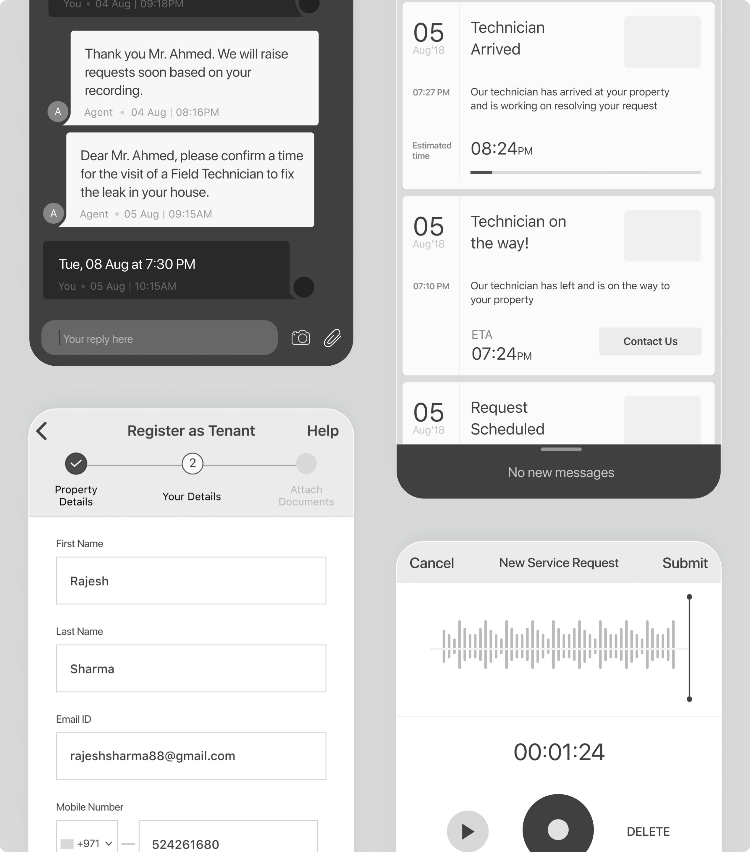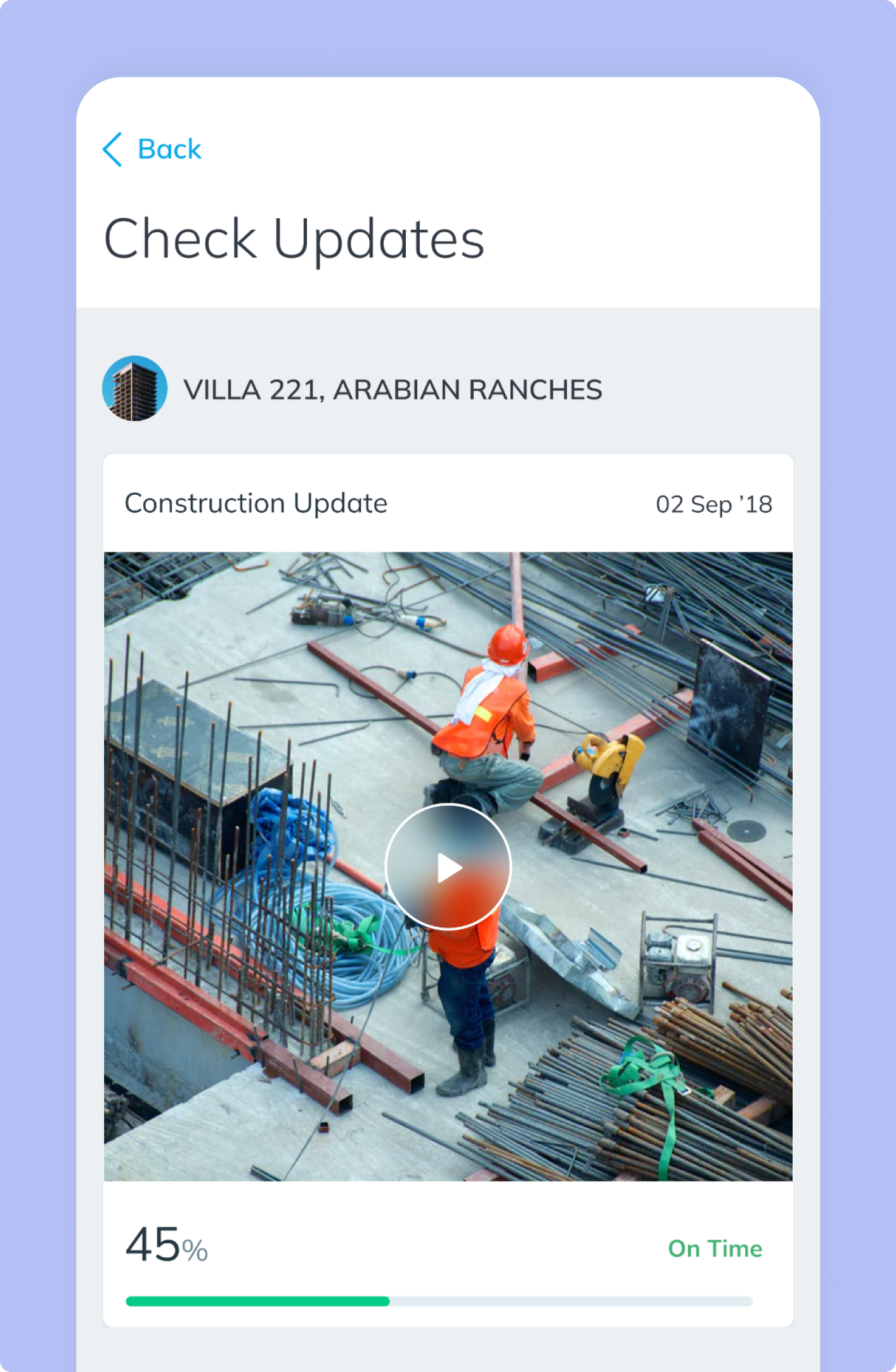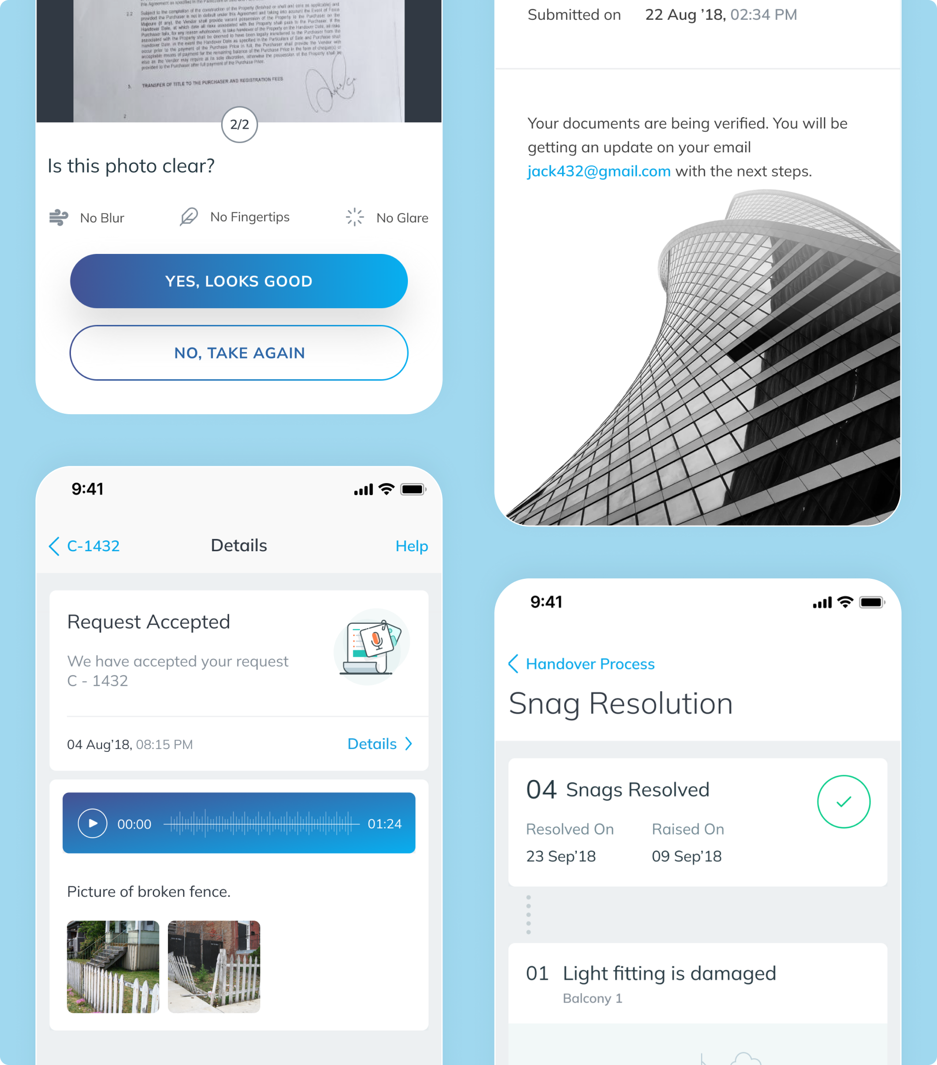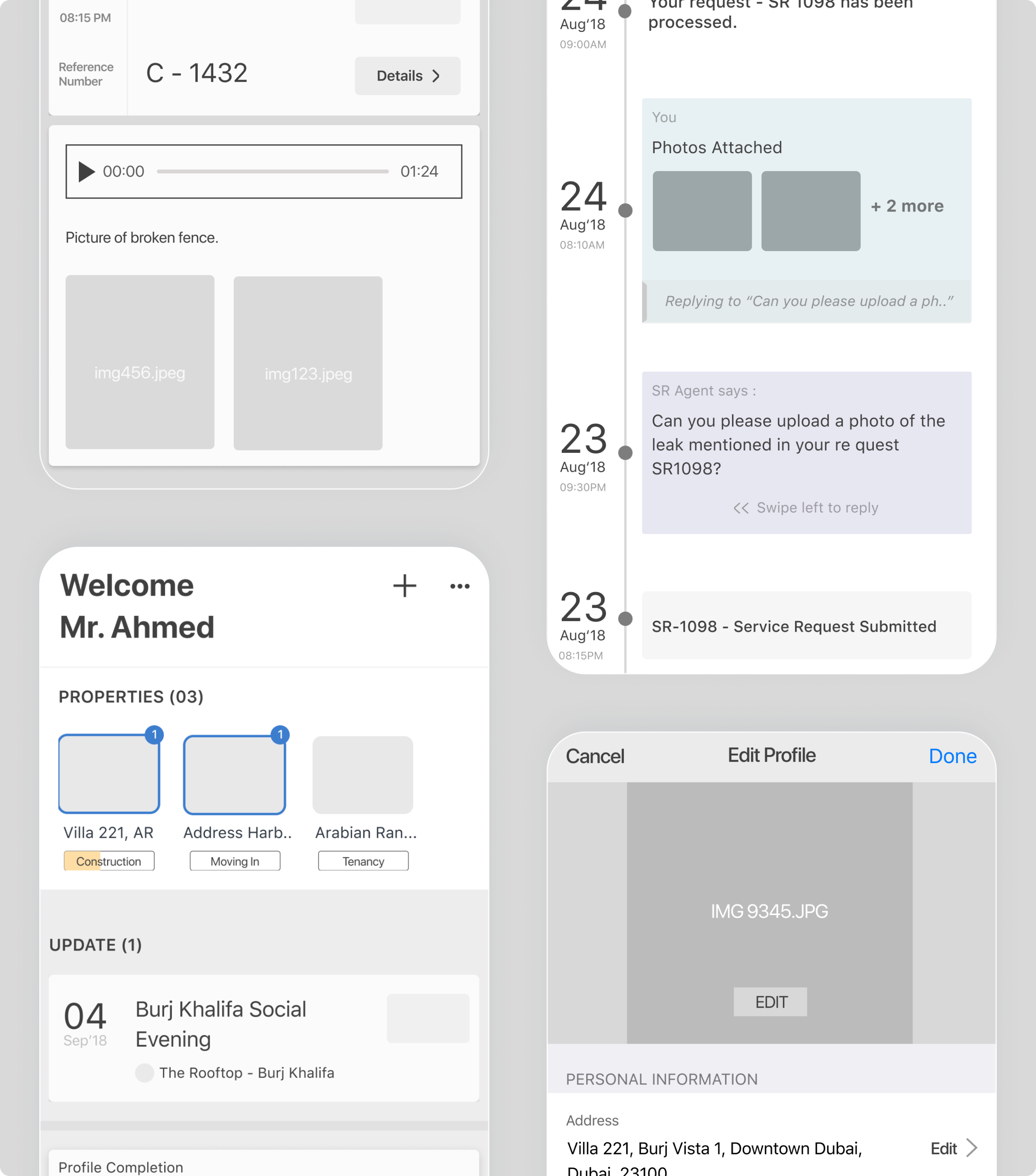 Mobile app UX enabling document uploads and real-time construction updates for seamless property management experience.