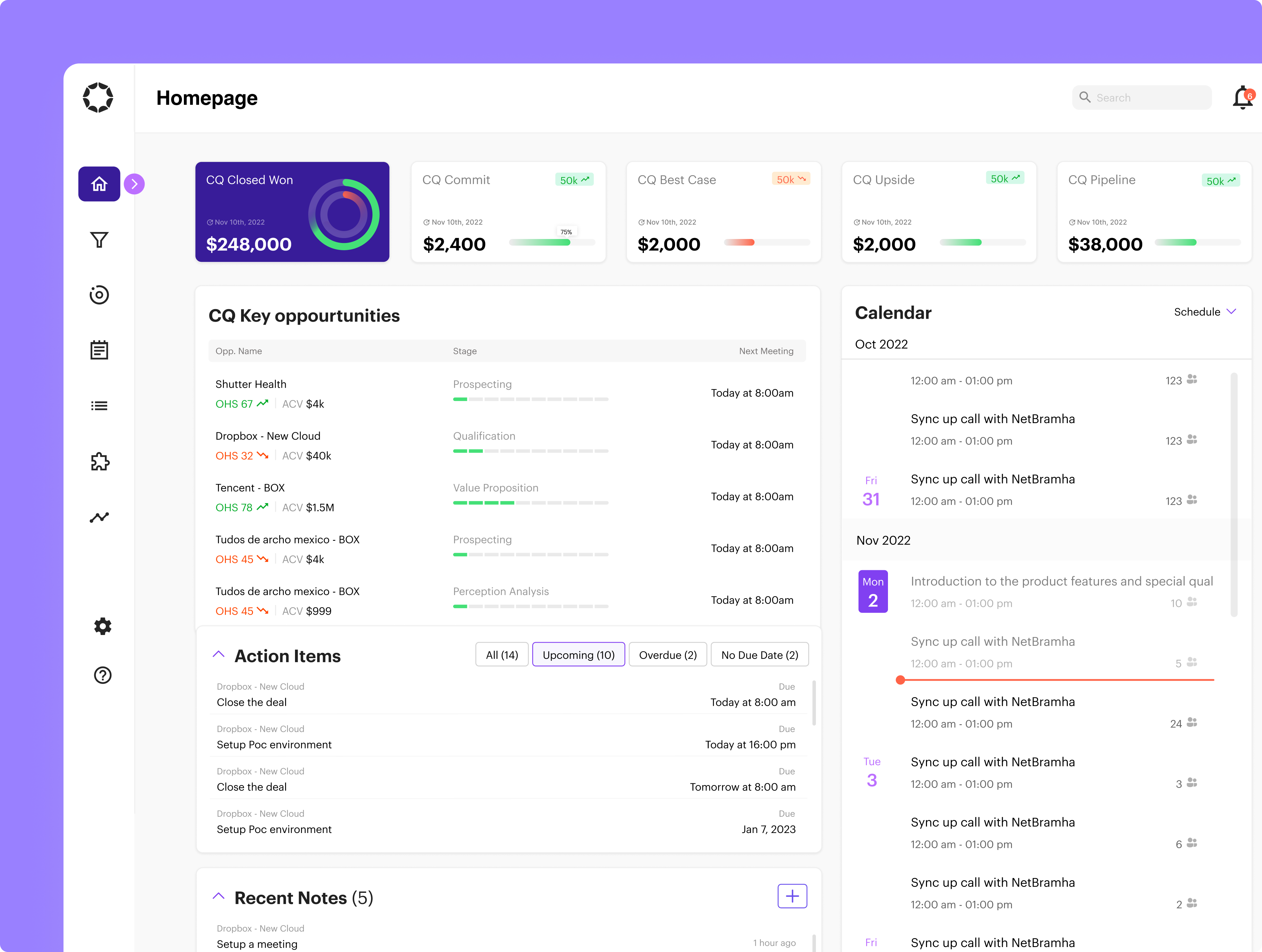The home workspace unifies opportunities, action items, and schedules with timelines, progress indicators, and embedded calendars for a consolidated operational view.