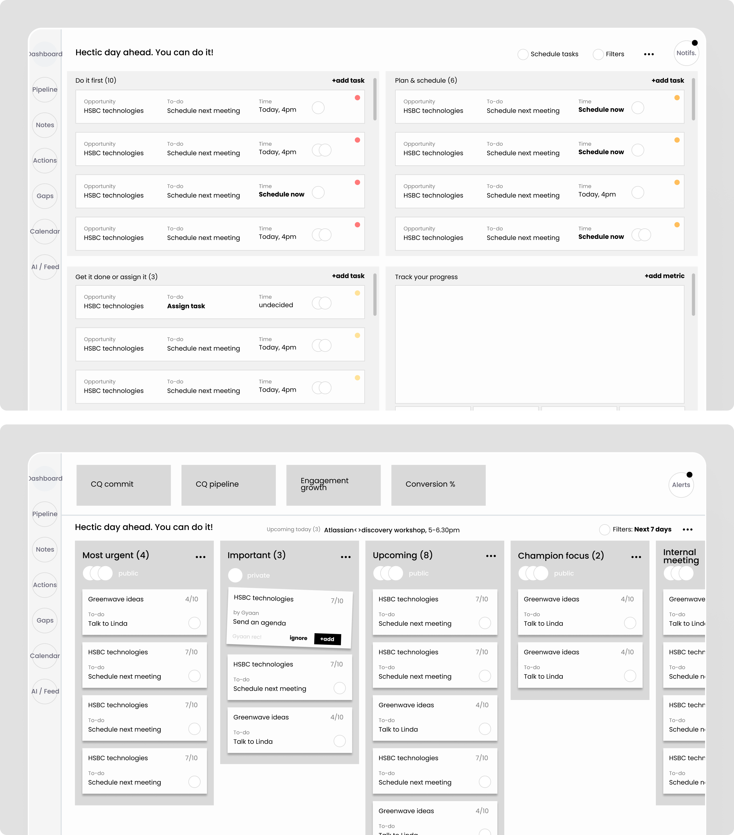 Multi-column task boards organize priorities through grouped layouts, card patterns, and status indicators for at-a-glance tracking, while wireframes defined workflow structure and interaction logic before visual execution.