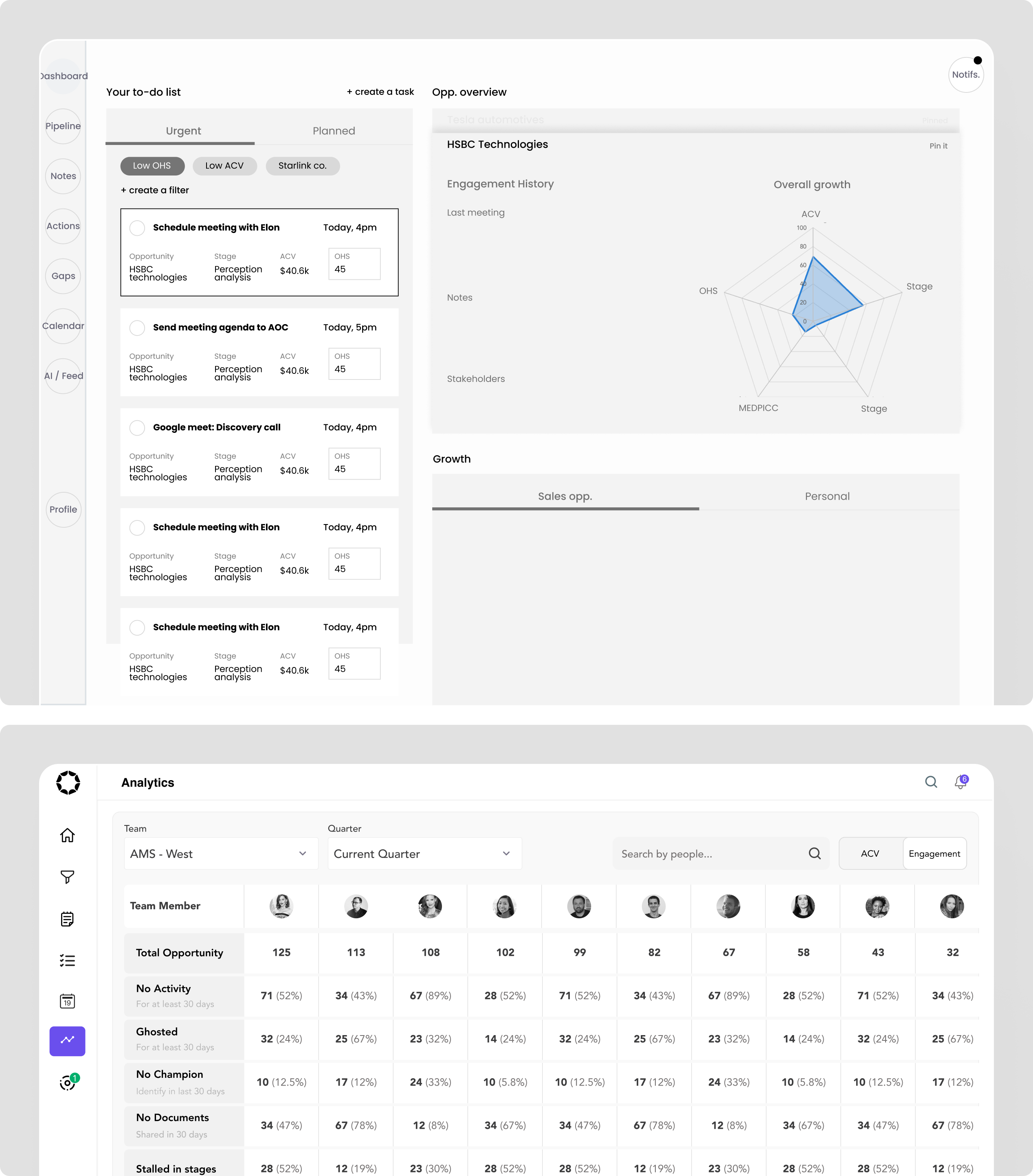 Dark mode dashboards with high-contrast visuals highlighted key opportunities and real-time analytics for sales teams.