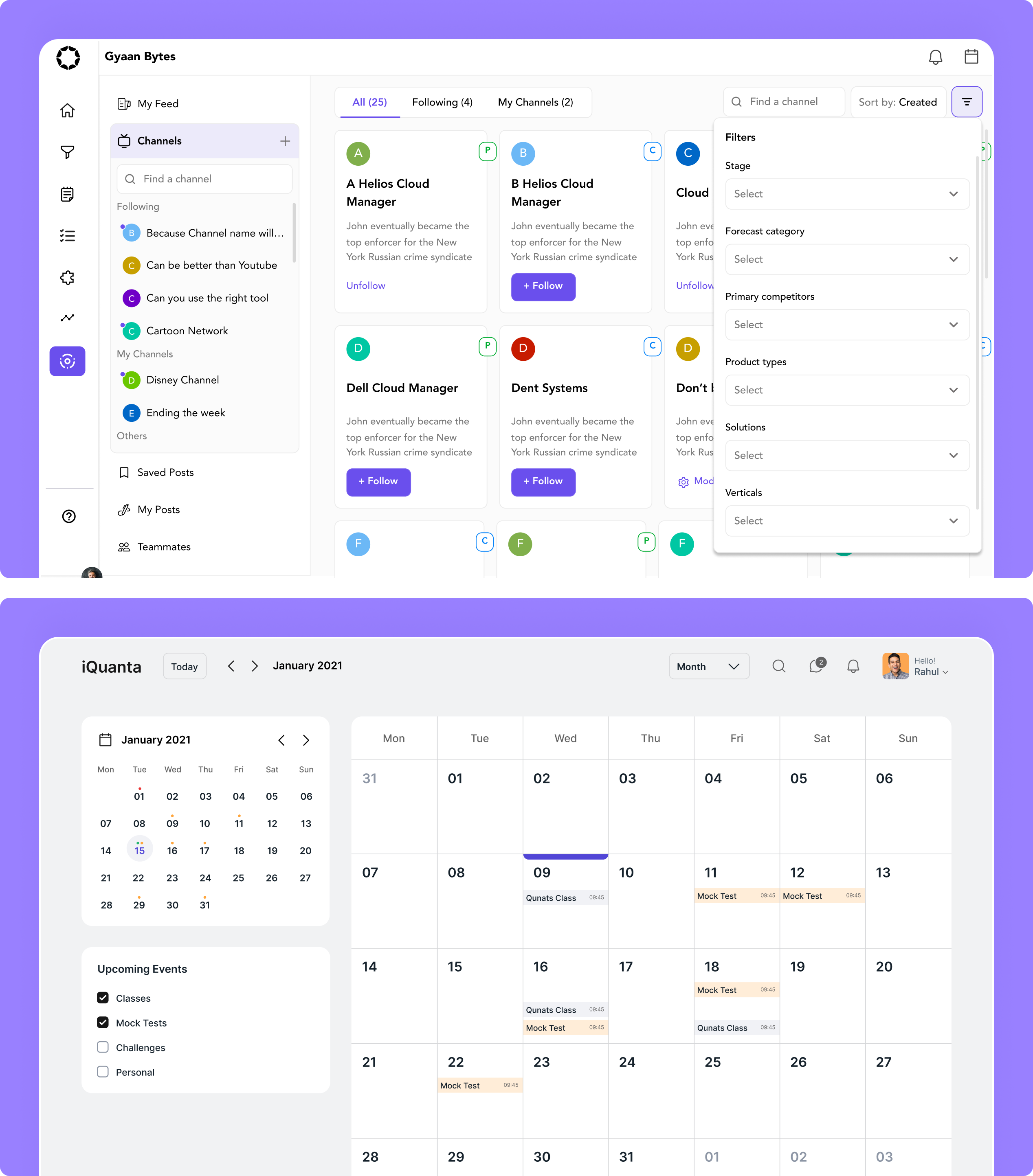 A modular feed design supports structured content discovery through advanced filters, consistent cards, and seamless sidebar navigation across channels.