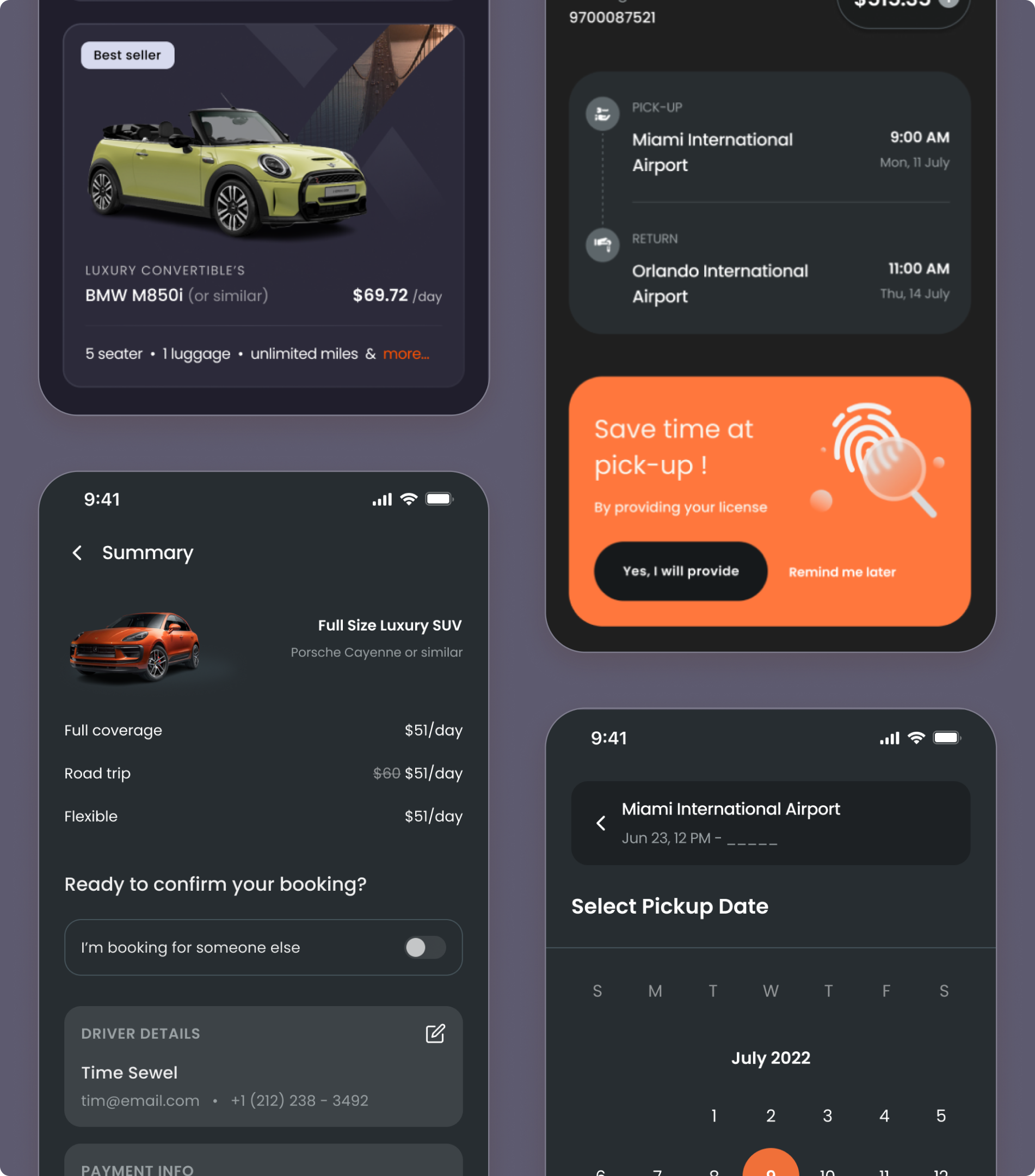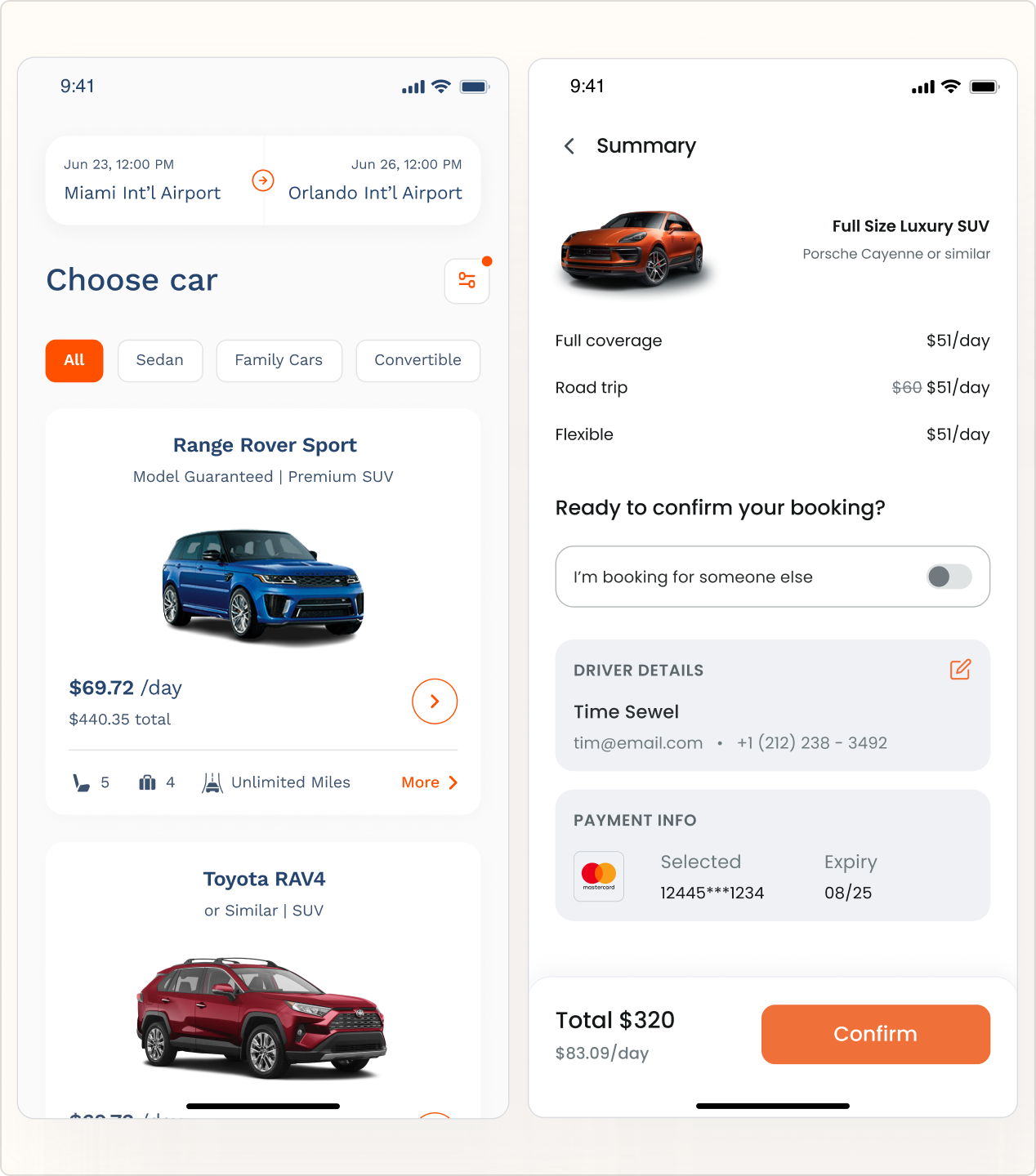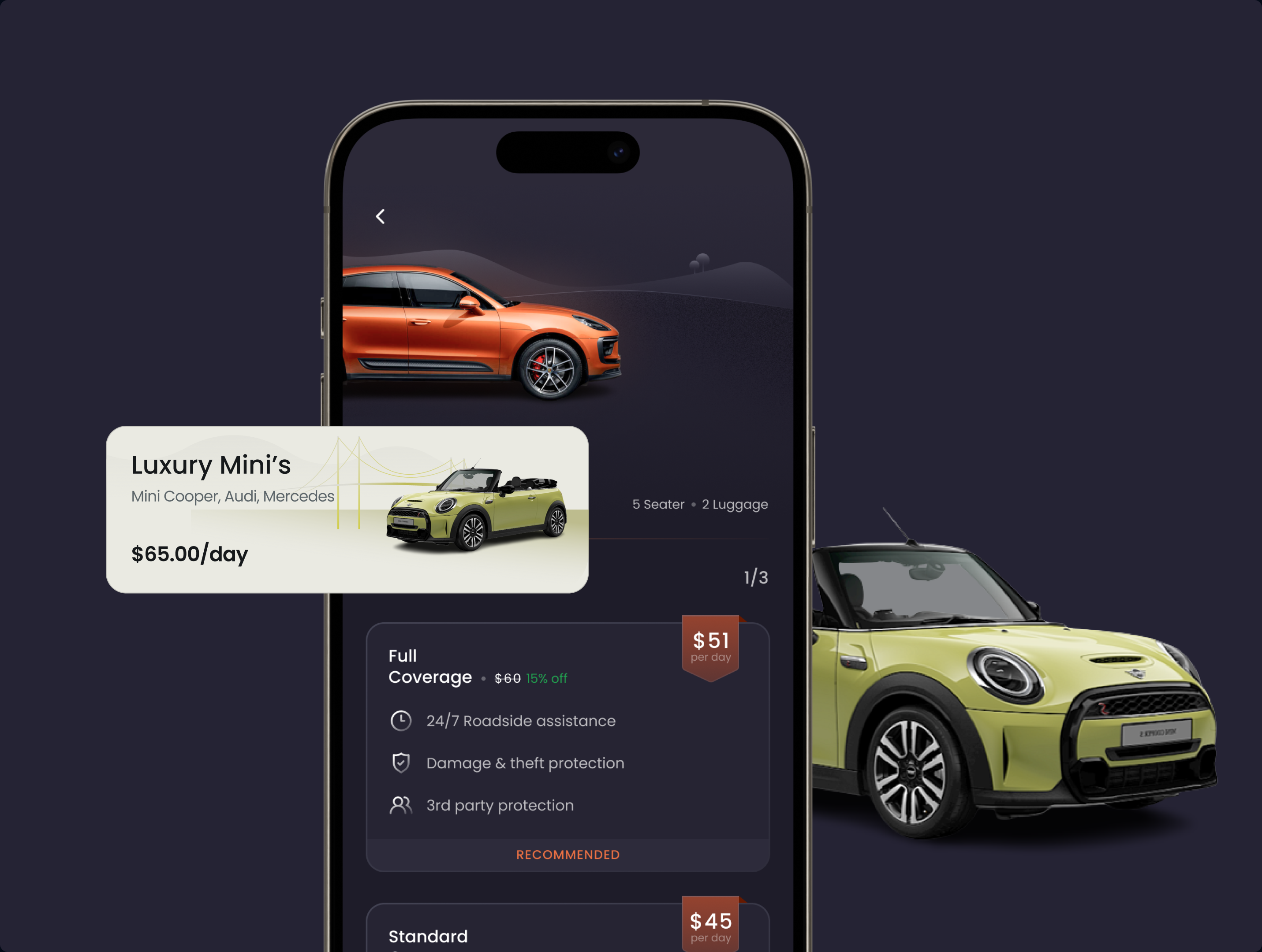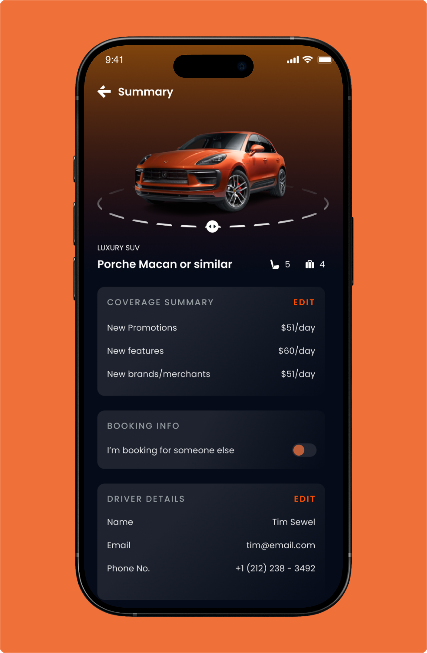Designed rental details with coverage, summary, and driver info to reduce friction, build trust, and enable confident booking decisions.
