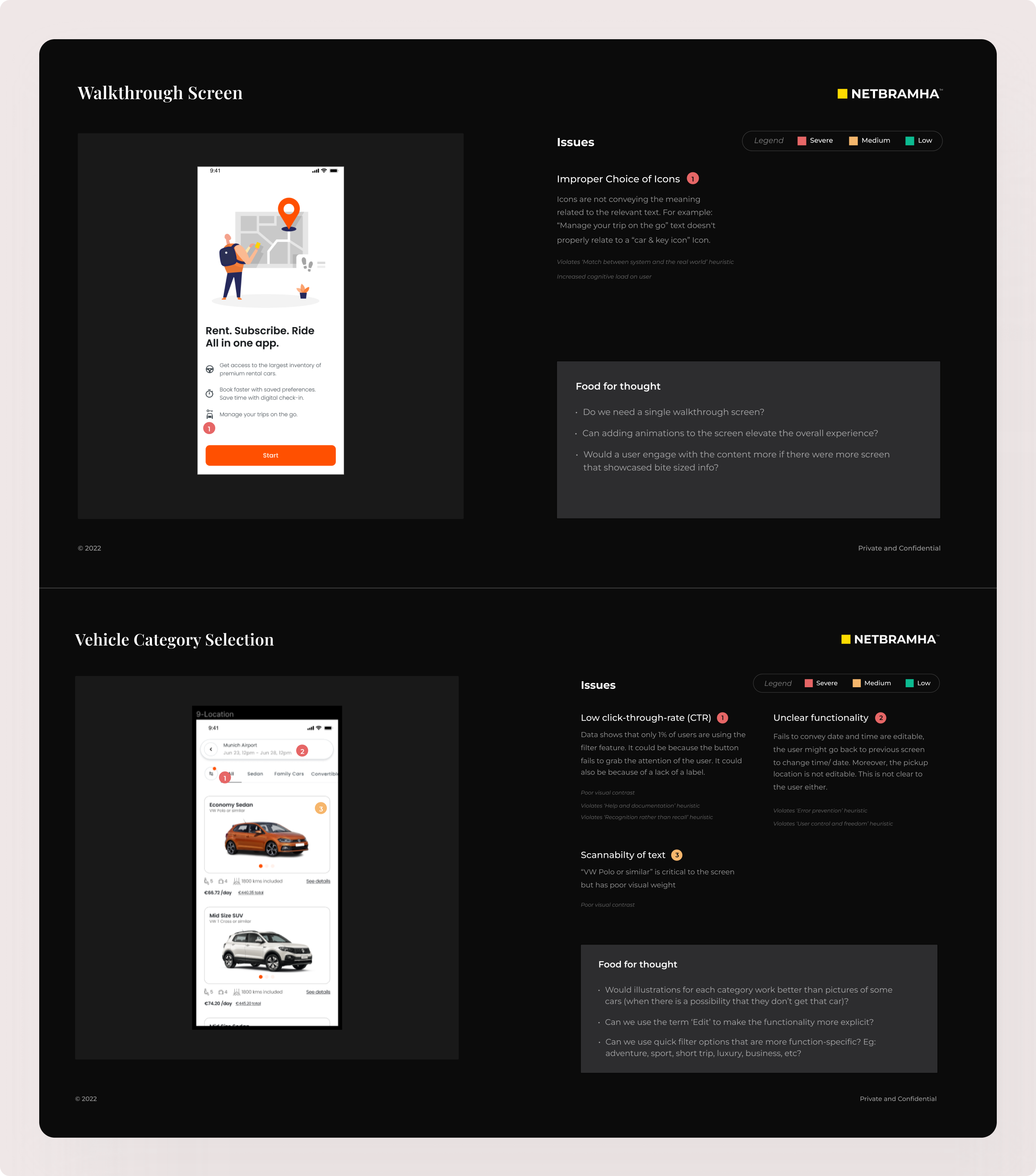 Our strategy focused on addressing customer complaints by delivering a robust solution that simplified the app experience for SIXT’s customers. We collaborated closely with SIXT’s in-house design team to enhance their existing design system, aiming to resolve three core issues. We conducted competitive benchmarking & heuristic studies to identify the reasons behind the high drop-off rates. By understanding these pain points, we could target the specific areas causing customer frustration. Additionally, we also aimed to build gain creators (while also reducing user pain points), such as introducing new revenue streams by cross/upselling products.